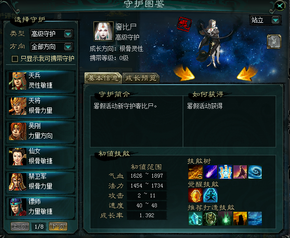 暑假活动抽奖守护为:大阿罗汉,奢比尸,梅仙,虎先锋。超级守护为:浪淘沙。抽奖次数达到230次将必然抽到高级守护,每个玩家只能选取一次高级守护奖励。