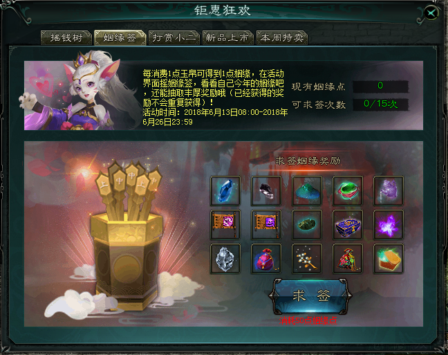 (1) 打开活动界面,消耗姻缘值求取姻缘签,每个玩家可最多求取15次姻缘签。